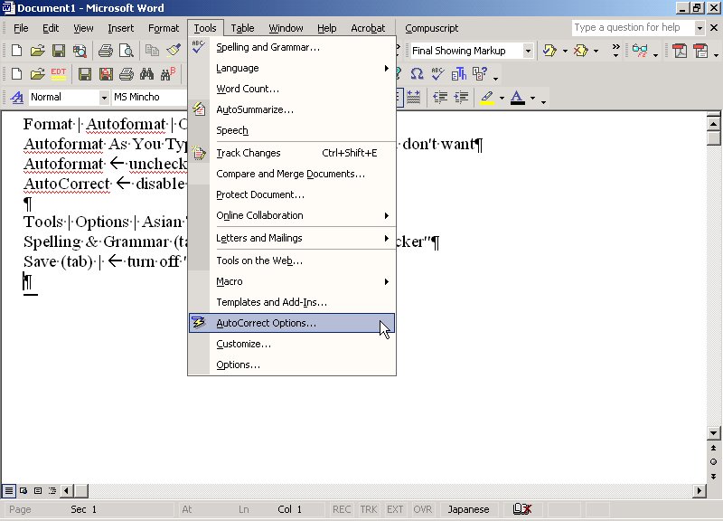 Aug. 17th, 2005 11:53 am...can one of you kind souls pleeeease give me directions on how to turn the autofuckupformat function of microsucksoft word 2000 off? I have to retype large portions of my ESL research paper translation because microsucksoft autofuckupformatted it when I wasn't looking. Serves me right for being a touch typist, I guess.